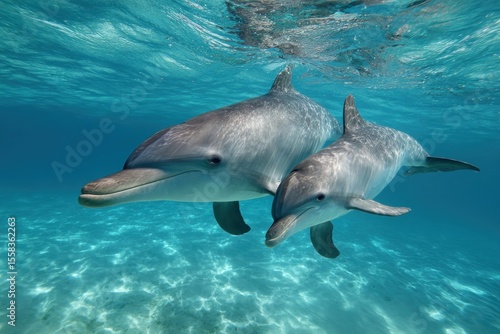 Fototapeta premium Two dolphins gracefully swim together in the clear blue ocean water.
