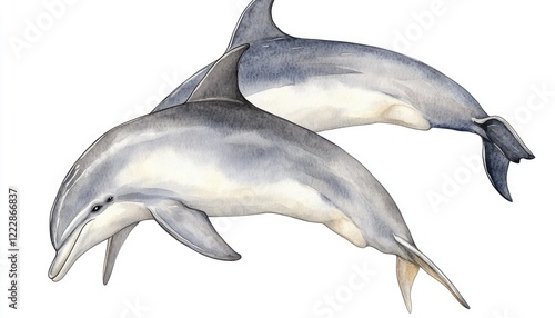 Fototapeta premium Two dolphins gracefully swimming side by side in a serene ocean setting,...