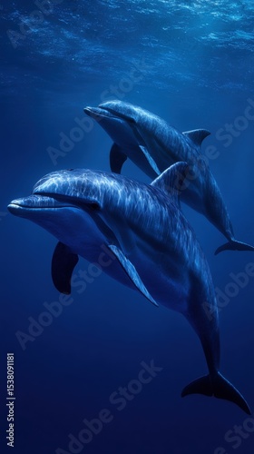 © 王二小, Fototapeta premium Two dolphins gracefully swimming underwater in deep blue ocean