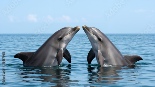 © Milan, Naklejka premium Two dolphins interacting in the ocean. Close up of two bottlenose dolphins facing each other in clear blue water.