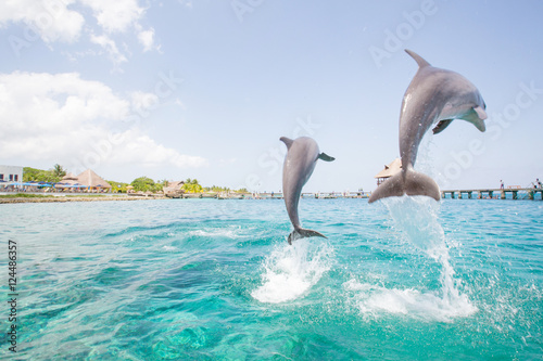 © triocean, Obraz premium Two dolphins jumping from the ocean