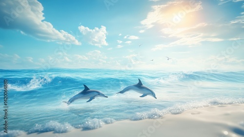 Fototapeta premium Two dolphins jumping playfully out of ocean waves near shoreline