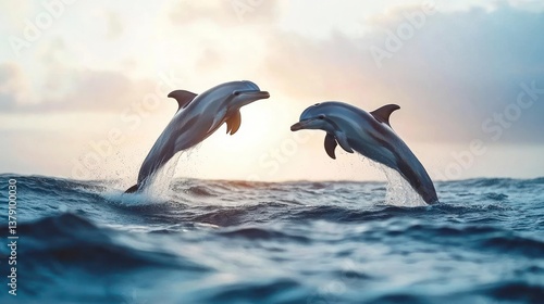 Fototapeta premium Two Dolphins Leap Above Ocean Waves at Sunrise