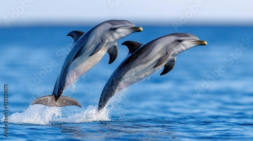 Fototapeta premium Two dolphins leap gracefully above the water, showcasing their playful nature...