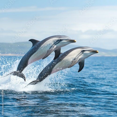 © MetaKibo, Obraz premium Two dolphins leaping above the ocean surface, creating splashes.
