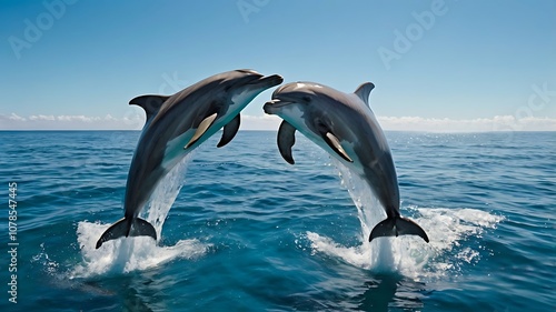 Fototapeta premium Two Dolphins Leaping and Touching Tails in the Ocean