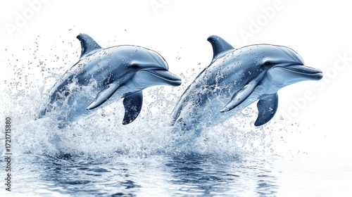 Fototapeta premium Two dolphins leaping from the ocean, splashing water. (1)
