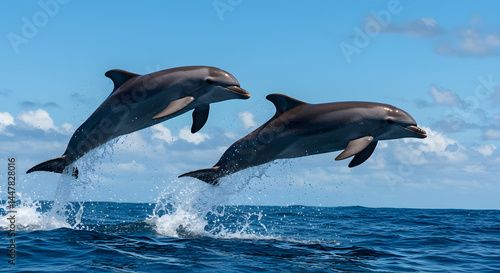 © verdian, Fototapeta premium Two Dolphins Leaping Gracefully over Ocean Waves Under a Sunny Sky
