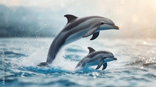 Fototapeta premium Two dolphins leaping in ocean waves