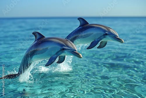 Fototapeta premium Two Dolphins Leaping Out of the Ocean Water