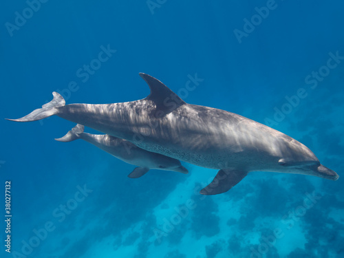 Naklejka premium Two dolphins (parent and baby) swimming in the blue tropical ocean