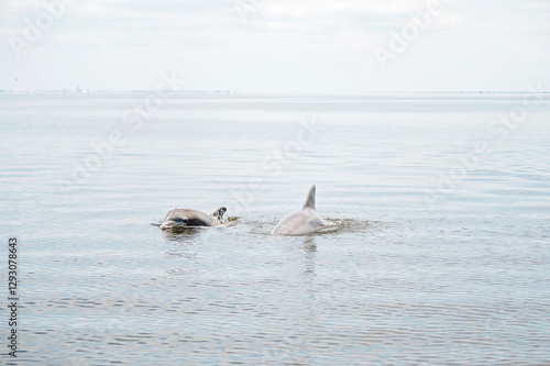 Fototapeta premium Two dolphins swim and surface in calm ocean waters