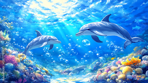 Fototapeta premium Two Dolphins Swim Gracefully Underwater Near Colorful Coral Reefs with...