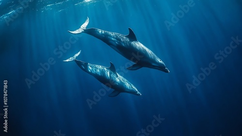 Fototapeta premium Two dolphins swim in a clear blue ocean, with sunbeams streaming through the...