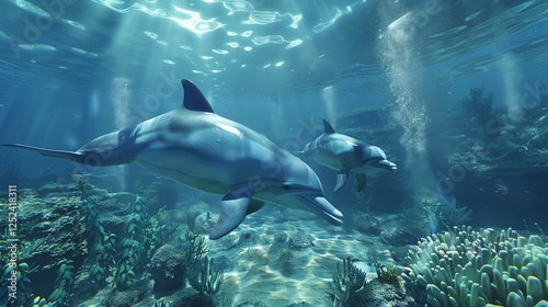 © Galib, Fototapeta premium Two dolphins swim through a coral reef in a clear blue ocean.