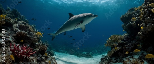 © Wannaeka, Naklejka premium two dolphins swimming around National Geographic style underwate