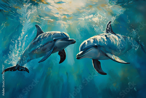 © Noufaldi, Fototapeta premium Two dolphins swimming gracefully underwater, showcasing marine life and beauty.