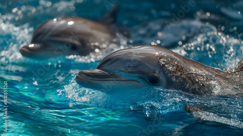 Obraz premium Two dolphins swimming in clear blue water with visible water splashing around