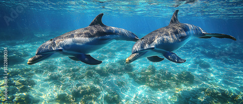 Fototapeta premium Two Dolphins Swimming in Clear Water