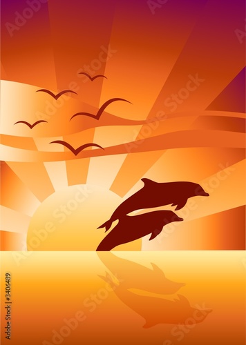 © roxxyphotos, Obraz premium two dolphins swimming in sunset background