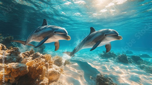 Fototapeta premium Two dolphins swimming over coral reef in sunlit ocean.