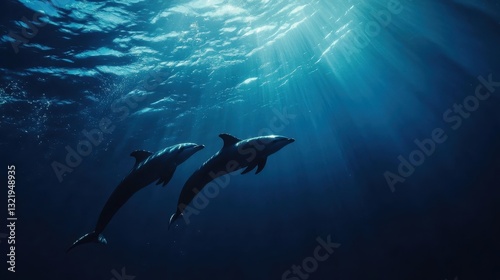 © Ariestia, Fototapeta premium Two Dolphins Swimming Underneath Ocean Surface In Sunlit Waters