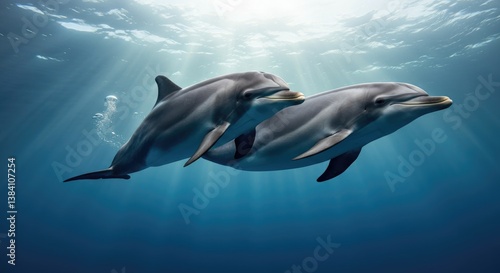 © Tati, Fototapeta premium Two dolphins swimming underwater with light rays above them