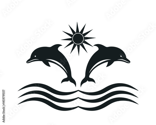© Smartcare, Naklejka premium Two dolphins with sun and ornate waves decorative marine silhouette on a white background