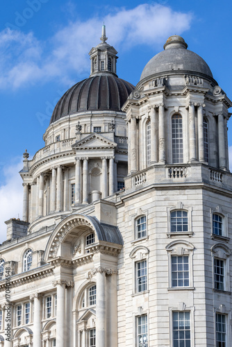 Obraz premium Two Domes on Classical Building Against Blue Sky in Liverpool, UK.