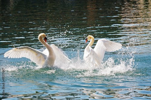 © marek_usz, Naklejka premium Two dominant swans battle, Reuss river