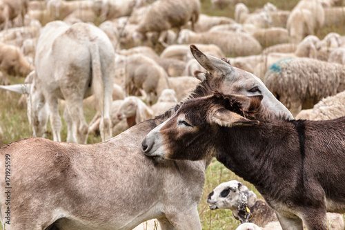 © Adriano, Obraz premium two donkeys having cuddle on a meadow