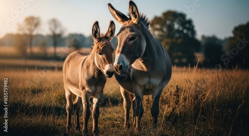 © ndandut, Fototapeta premium Two donkeys, one young, in a field at sunrise