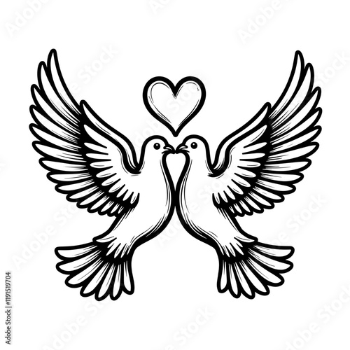Fototapeta premium Two doves forming a heart in black and white illustration, love symbol