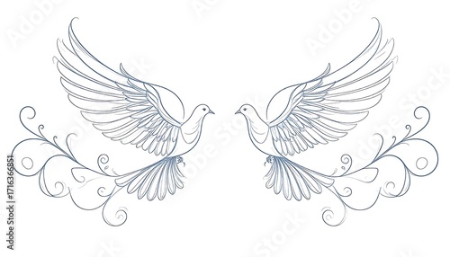 Obraz premium Two doves in flight, stylized with decorative swirls