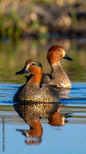 © Dea, Fototapeta premium Two ducks swim peacefully on reflective water