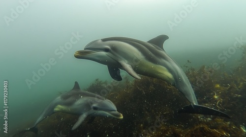 Obraz premium Two dusky dolphins swimming near kelp forest.