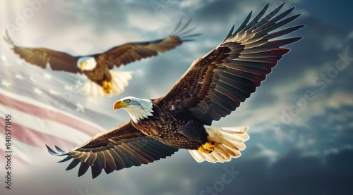 Naklejka premium Two eagles flying over a flag, US Independence Day 4th of July concept