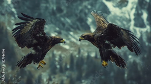 © Ariestia, Obraz premium Two eagles soar majestically in front of mountainous landscape