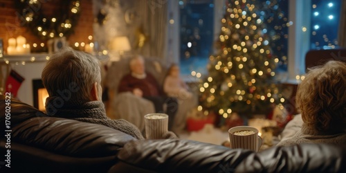 © Mr. Mike, Obraz premium Two elderly individuals sitting on a couch, enjoying a warm beverage and watching television in a cozy living room decorated for Christmas, with a Christmas tree and festive lights in the background.