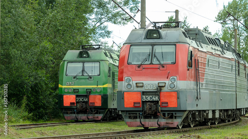 © Mihail, Obraz premium two electric trains standing on the railway tracks in the depot