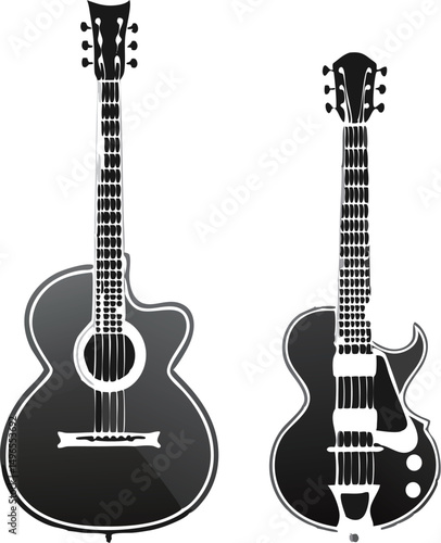 Obraz premium Two elegant black guitars: an acoustic and an electric, showcasing...