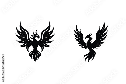 © Aroti, Obraz premium Two elegant black phoenix silhouettes displayed against a bright white background design