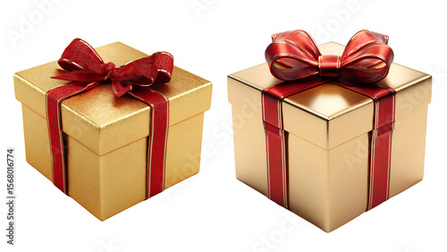 © Kai Ka Ala le, Fototapeta premium Two Elegant Golden Gift Boxes with Red Ribbons Isolated on White Background – Holiday Present Package Clipart