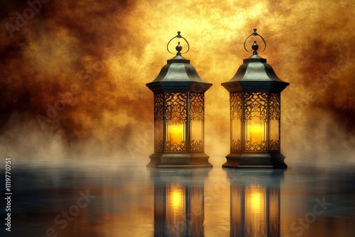 © mohdfaizal, Fototapeta premium Two Elegant Lanterns with Intricate Designs Illuminated by Warm Golden Light on a Misty Background Creating a Magical and Inviting Atmosphere