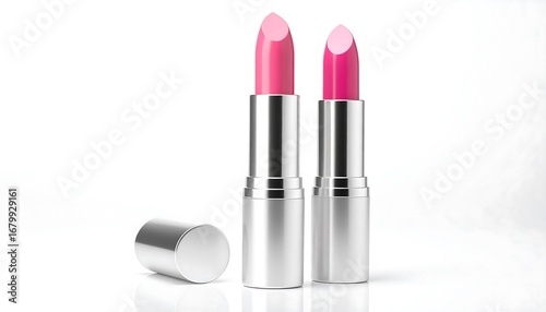 © Iyat, Obraz premium Two elegant, light pink lipsticks in metallic silver containers are displayed against a pure white background.