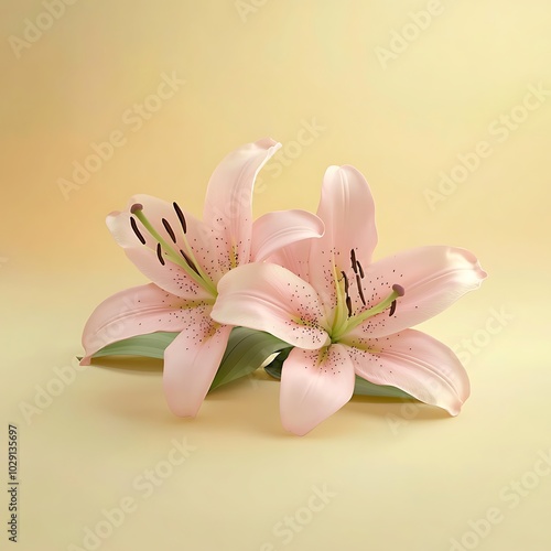 © Tanakrit, Naklejka premium Two elegant pink lilies bloom gracefully against a soft yellow backdrop, showcasing their delicate petals and intricate details.
