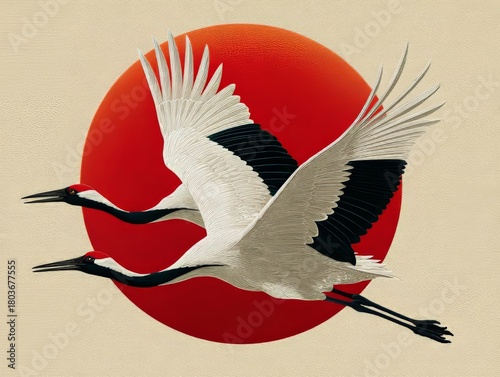 © Julia, Obraz premium Two elegant red crowned cranes flying gracefully against a vibrant red sun are the focal point of a Japanese inspired artwork