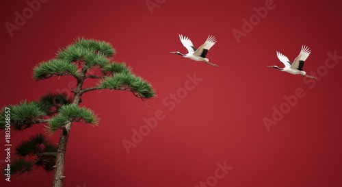 Naklejka premium Two elegant red-crowned cranes soaring past a traditional bonsai pine tree against a vibrant red backdrop