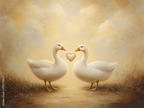 © Nitid, Obraz premium Two elegant white geese stand facing each other, forming heart shape with their necks against soft, dreamy background
