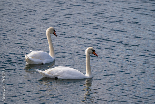 Obraz premium Two elegant white swans glide side by side across calm rippling water under a...